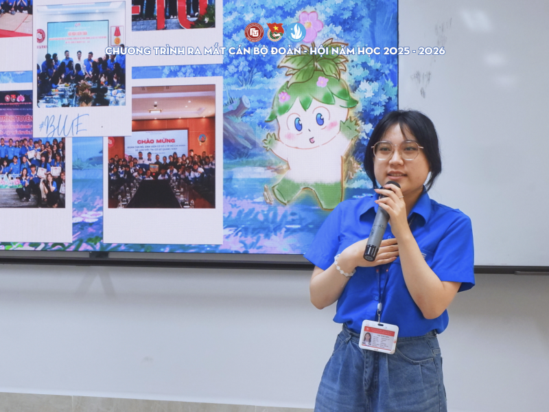 Đồng chí Đỗ Huỳnh Thanh Thảo - Ủy viên Ban Thường vụ Đoàn Thanh niên, Chủ tịch Hội Sinh viên trường, giới thiệu về cơ cấu tổ chức và các hoạt động thường niên của Hội Sinh viên