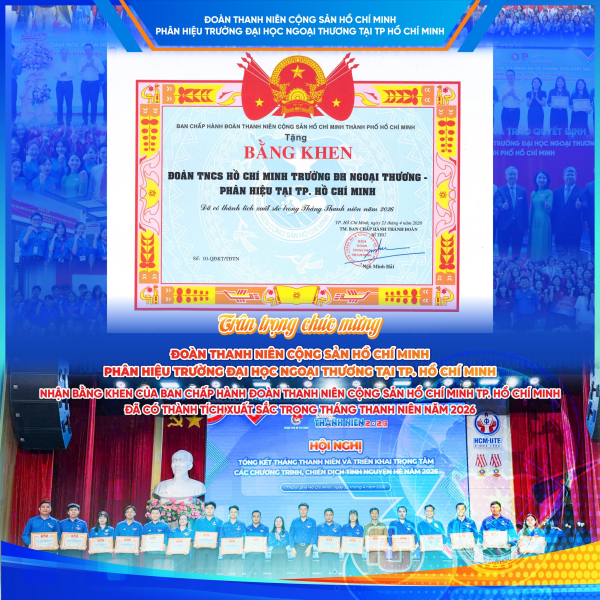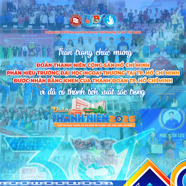 364Sáng ngày 22/4/2026, tại Hội nghị Tổng kết Tháng Thanh niên và triển khai trọng tâm các chương trình, chiến dịch tình nguyện hè năm 2026 do Thành Đoàn TP. Hồ Chí Minh tổ chức, Đoàn Thanh niên Cộng sản Hồ Chí Minh Phân hiệu Trường Đại học Ngoại thương tại TP. Hồ Chí Minh vinh dự được trao tặng Bằng khen của Ban Chấp hành Đoàn Thanh niên Cộng sản Hồ Chí Minh vì đã có thành tích xuất sắc trong Tháng Thanh niên năm 2026.