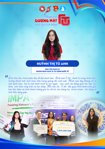 1865Đồng chí Huỳnh Thị Tú Anh - Lớp trưởng K62CLC2 - Ngành đào tạo Ngân hàng và Tài chính quốc tế, Trường Đại học Ngoại Thương Cơ sở II tại TP. HCM. Với Tú Anh, hành trình chinh phục danh hiệu “Sinh viên 5 tốt” không phải là một đích đến cuối cùng mà là quá trình “Pay it forward” – cho đi, lan tỏa giá trị tích cực và không ngừng hoàn thiện phiên bản tốt hơn của chính mình. Bí quyết của Tú Anh nằm ở việc chủ động cân bằng giữa học tập và hoạt động ngoại khóa, biến áp lực thành động lực thông qua kỷ luật, tinh thần lạc quan và sự bền bỉ. Đối với cô, môi trường Ngoại thương chính là bệ phóng giúp bản thân tự tin khám phá, thử thách và định hình con đường phát triển riêng.