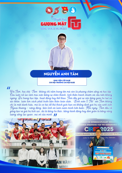 Hành trình tham gia và cống hiến trong phong trào Đoàn Thanh niên – Hội Sinh viên: Trong một năm học tập và rèn luyện vừa qua, Nguyễn Anh Tâm đã tích cực tham gia nhiều hoạt động, phong trào của Hội Sinh viên như Chiến dịch Xuân Tình nguyện, Ngày hội Câu lạc bộ – Đội – Nhóm (Club Fair) và đặc biệt là Hội thao Cơ sở II – FTU Games. Thông qua các hoạt động này, Tâm không chỉ được trải nghiệm môi trường sinh hoạt tập thể năng động mà còn tích lũy thêm nhiều kinh nghiệm thực tiễn, rèn luyện tinh thần kỷ luật, trách nhiệm và khả năng thích nghi trong các hoạt động phong trào sinh viên.