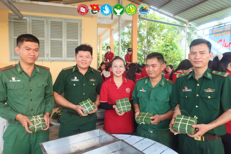 Khoảnh khắc Tạ Nguyễn Như Anh cùng các anh chiến sĩ Bộ đội Biên phòng gói bánh chưng,
