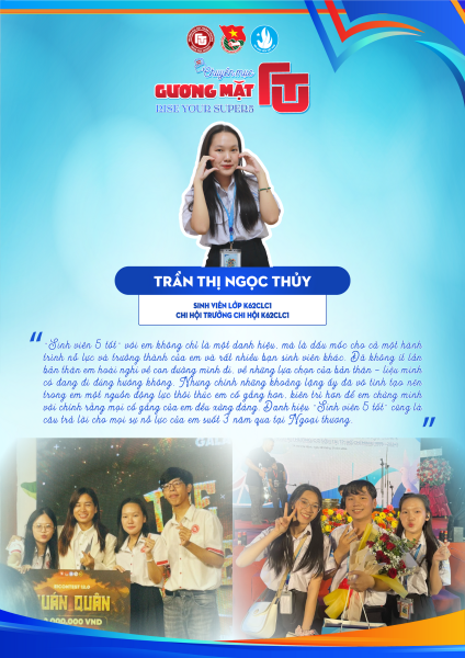 763Đồng chí Trần Thị Ngọc Thủy - Sinh viên lớp K62CLC1, ngành đào tạo Quản trị Kinh doanh Quốc tế, Trường Đại học Ngoại thương Cơ sở II tại TP. Hồ Chí Minh – là một trong những gương mặt tiêu biểu vừa vinh dự đạt danh hiệu “Sinh viên 5 tốt” cấp Thành phố năm học 2024 – 2025. Với Thủy, danh hiệu này không chỉ là sự ghi nhận thành tích mà còn là minh chứng cho một hành trình kiên trì, không ngừng nỗ lực hoàn thiện bản thân. Thủy luôn tin rằng yếu tố quan trọng nhất để trở thành “Sinh viên 5 tốt” chính là tinh thần bền bỉ, dám đứng lên sau những lần vấp ngã và không ngừng học hỏi từ chính những trải nghiệm của mình.