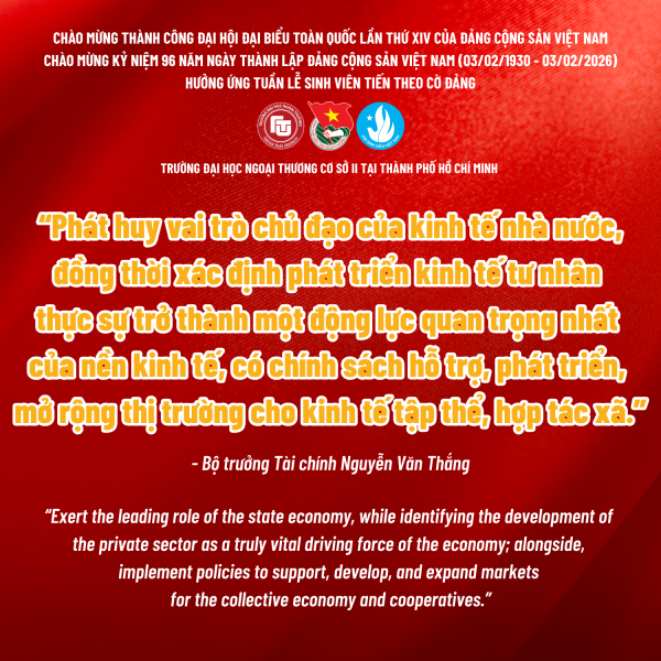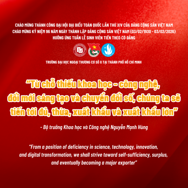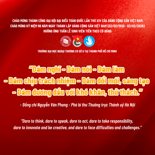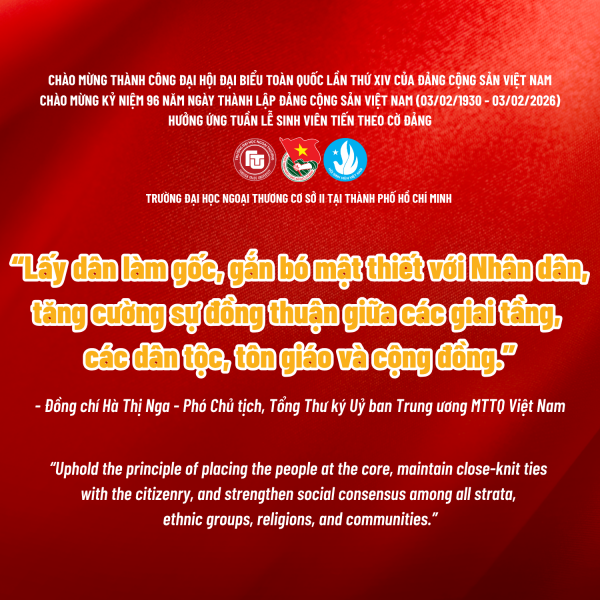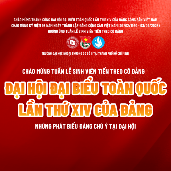 Hưởng ứng không khí phấn khởi chào mừng thành công của Đại hội XIV và kỷ niệm 96 năm Ngày thành lập Đảng Cộng sản Việt Nam (03/02/1930 – 03/02/2026), Tuần lễ “Sinh viên Thành phố Hồ Chí Minh tiến theo cờ Đảng” được tổ chức nhằm lan tỏa tinh thần trách nhiệm, niềm tự hào và niềm tin sâu sắc của tuổi trẻ đối với sự lãnh đạo của Đảng.