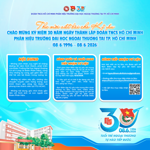 33Hướng tới kỷ niệm 30 năm thành lập Đoàn Thanh niên Phân hiệu Trường Đại học Ngoại thương tại TP. Hồ Chí Minh (08/6/1996 – 08/6/2026), Ban Thường vụ Đoàn Phân hiệu trân trọng gửi lời mời đến Quý Thầy Cô, Anh Chị, Quý đồng chí cán bộ Đoàn và đoàn viên các thế hệ cùng tham gia đóng góp bài viết, hình ảnh cho Kỷ yếu 30 năm.