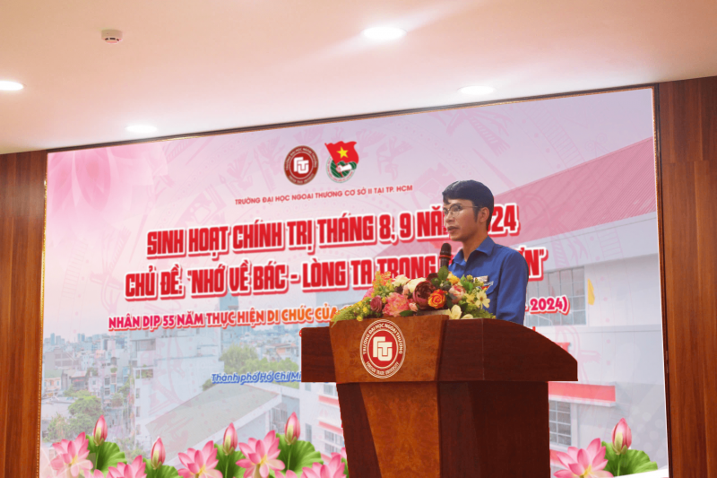 14783Nhân dịp kỷ niệm 55 năm thực hiện Di chúc Chủ tịch Hồ Chí Minh (1969 - 2024), Ngày 12/9/2024, Đoàn trường Đại học Ngoại thương Cơ sở II tại TP. Hồ Chí Minh tổ chức sinh hoạt chính trị tháng 8, 9 năm 2024 – Chủ đề: “Nhớ về Bác – Lòng ta trong sáng hơn” tại Hội trường B001 – Cơ sở II Trường Đại học Ngoại thương tại TP. Hồ Chí Minh với sự tham gia của hơn 100 đoàn viên, sinh viên.