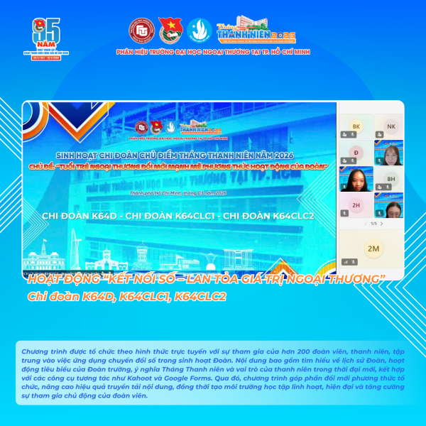 174Nằm trong chuỗi hoạt động Tháng Thanh niên năm 2026, chương trình “Kết nối số – Lan tỏa giá trị Ngoại thương” được tổ chức dưới hình thức trực tuyến đã mang đến một không gian sinh hoạt mới mẻ, linh hoạt và giàu tính tương tác cho đoàn viên, thanh niên.
