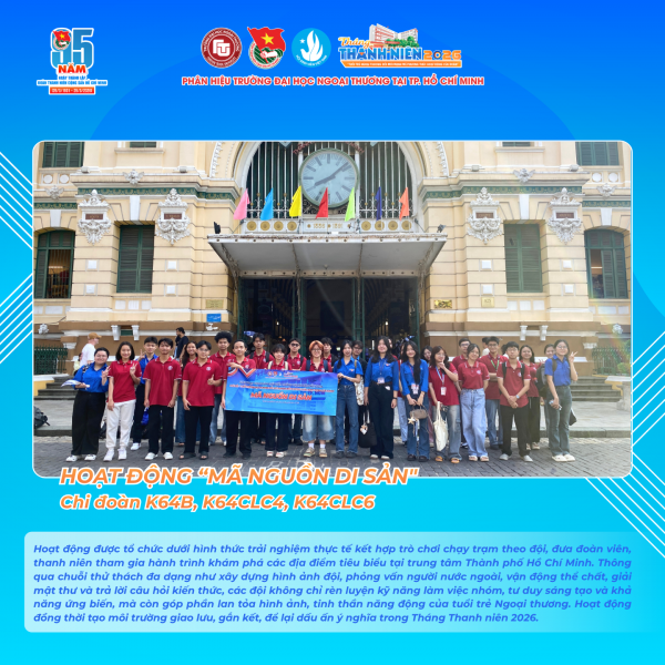 Không chỉ mang đến những trải nghiệm sôi nổi, chương trình còn góp phần lan tỏa hình ảnh năng động, tự tin của tuổi trẻ Ngoại thương, đồng thời tăng cường sự gắn kết giữa các đoàn viên. Đây chính là hành trình ý nghĩa, tiếp thêm động lực để mỗi bạn trẻ không ngừng rèn luyện, bứt phá và ghi dấu thanh xuân bằng những trải nghiệm đáng nhớ.