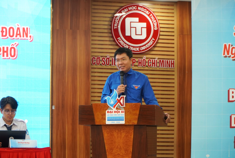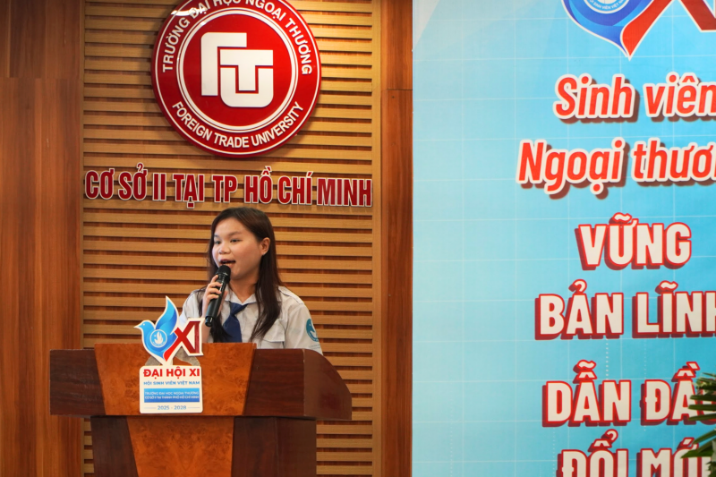 Tại Đại hội, đồng chí Nguyễn Đăng Khoa - Phó Bí thư, Chủ nhiệm Ủy ban Kiểm tra Thành Đoàn TP. Hồ Chí Minh đã có bài phát biểu chỉ đạo đầy tâm huyết. Mở đầu, đồng chí đã gửi lời thăm hỏi ân cần tới các hội viên có gia đình bị ảnh hưởng bởi cơn bão số 5 tại khu vực miền Trung, thể hiện sự quan tâm sâu sắc. Đồng chí ghi nhận và biểu dương những thành tích xuất sắc mà Hội Sinh viên trường đã đạt được trong một nhiệm kỳ đầy biến động và thách thức, nhấn mạnh rằng những kết quả này là minh chứng rõ nét cho tinh thần trách nhiệm, sự nhiệt huyết, sáng tạo và nội lực mạnh mẽ của tập thể sinh viên FTU. Đồng chí cũng đánh giá cao vai trò tiên phong của Hội trong việc triển khai các phong trào hành động cách mạng, chủ động kết nối và thích ứng với thời đại, cũng như trong công tác đồng hành, hỗ trợ sinh viên học tập, rèn luyện và phát triển toàn diện. Bên cạnh đó, đồng chí Nguyễn Đăng Khoa cũng gợi mở, định hướng Hội Sinh viên trường tiếp tục phát huy hơn nữa tinh thần đoàn kết, tính chủ động, sáng tạo và khả năng hội nhập, góp phần khẳng định vị thế của sinh viên Ngoại thương trong các phong trào thanh niên, sinh viên của Thành phố và cả nước, đồng thời khuyến khích Hội tăng cường phối hợp với các đoàn phường, xã để tạo ra nhiều sân chơi bổ ích, thiết thực cho sinh viên.