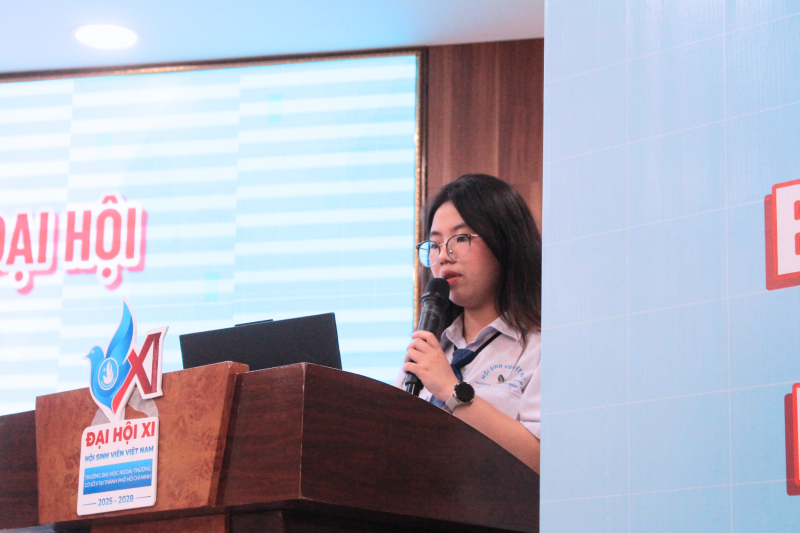 Đánh giá tổng kết lại kết quả thực hiện Nghị quyết Đại hội đại biểu Hội Sinh viên Việt Nam Trường lần thứ X, nhiệm kỳ 2023 - 2025, Đại hội đã được xem thước phim tổng kết công tác Hội và phong trào sinh viên nhiệm kỳ 2023 - 2025 với nhiều hoạt động và thành tựu nổi bật. Đồng thời, đồng chí Ngô Nguyễn Phương Vy thay mặt Đoàn Chủ tịch nhận định, đánh giá về kết quả triển khai, thực hiện các phong trào, hoạt động. Từ những kinh nghiệm rút ra cùng với bối cảnh, mục tiêu mới, đồng chí Đỗ Huỳnh Thanh Thảo - Phó Chủ tịch Hội Sinh viên trường khóa IX đã trình bày tóm tắt mục tiêu, phương hướng, nhiệm vụ, giải pháp công tác Hội và phong trào sinh viên Trường giai đoạn 2025 - 2028 với khẩu hiệu hành động: “SINH VIÊN NGOẠI THƯƠNG - VỮNG BẢN LĨNH - DẪN ĐẦU ĐỔI MỚI - TIÊN PHONG HỘI NHẬP”.